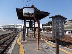 現飯山駅から新幹線駅に 設けられた在来線ホーム を見る。 |
